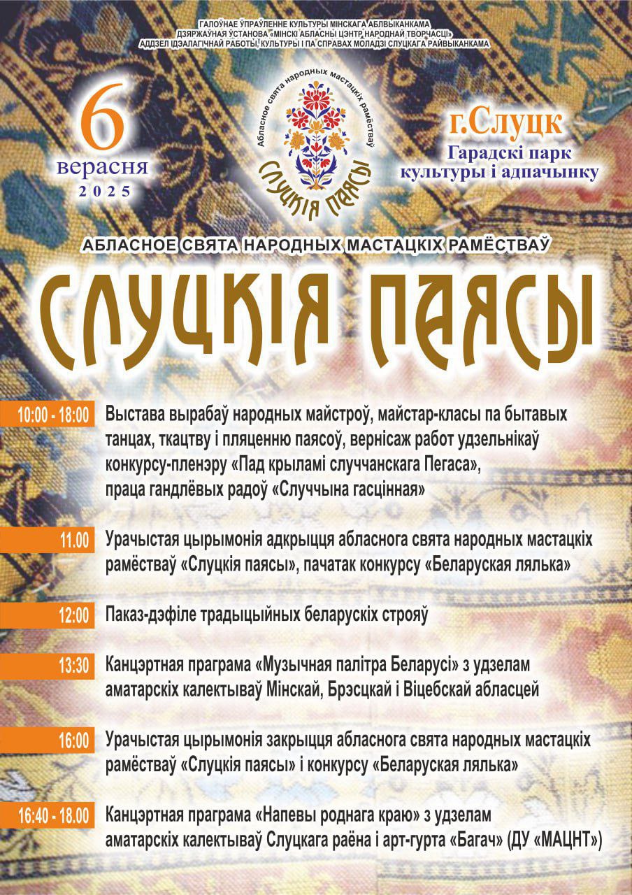 Областной праздник народных художественных ремесел «Слуцкие пояса» пройдет 6 сентября 2025 года в г. Слуцке.